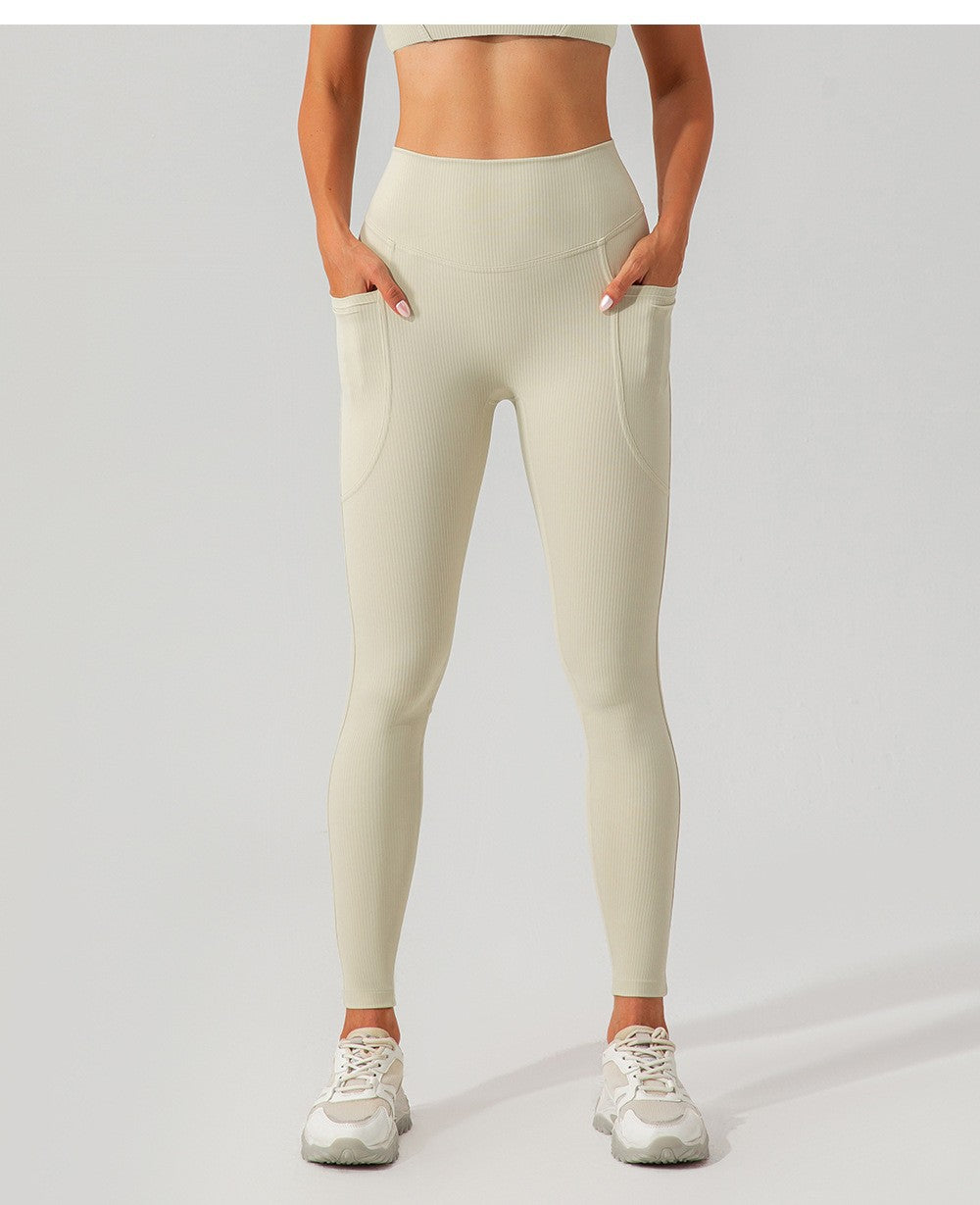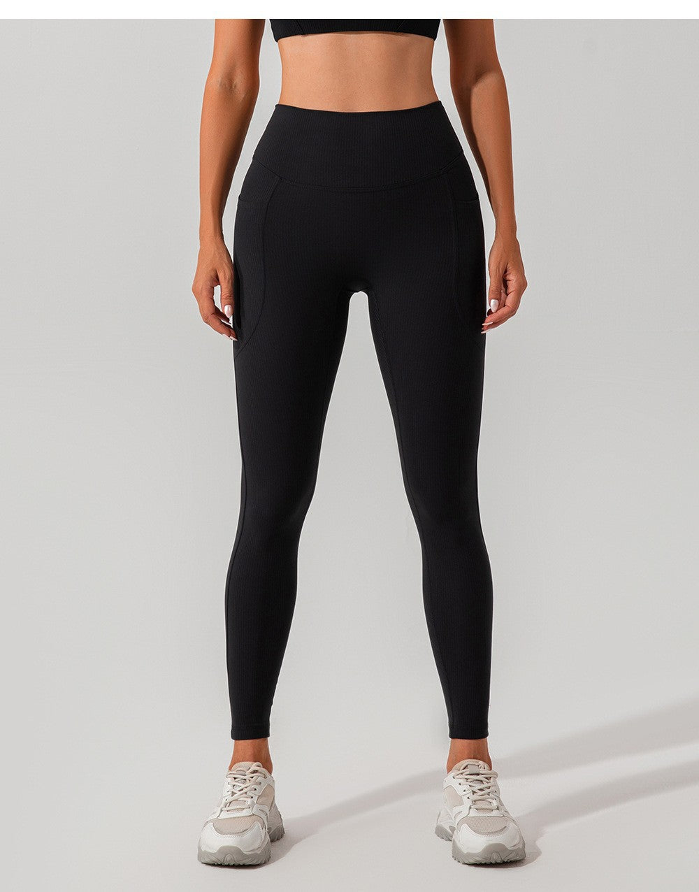 European and American Threaded High Waist Hip Lifting Yoga Pants Pocket Tight Sports Pants Running Speed Drying Fitness Pants for Women